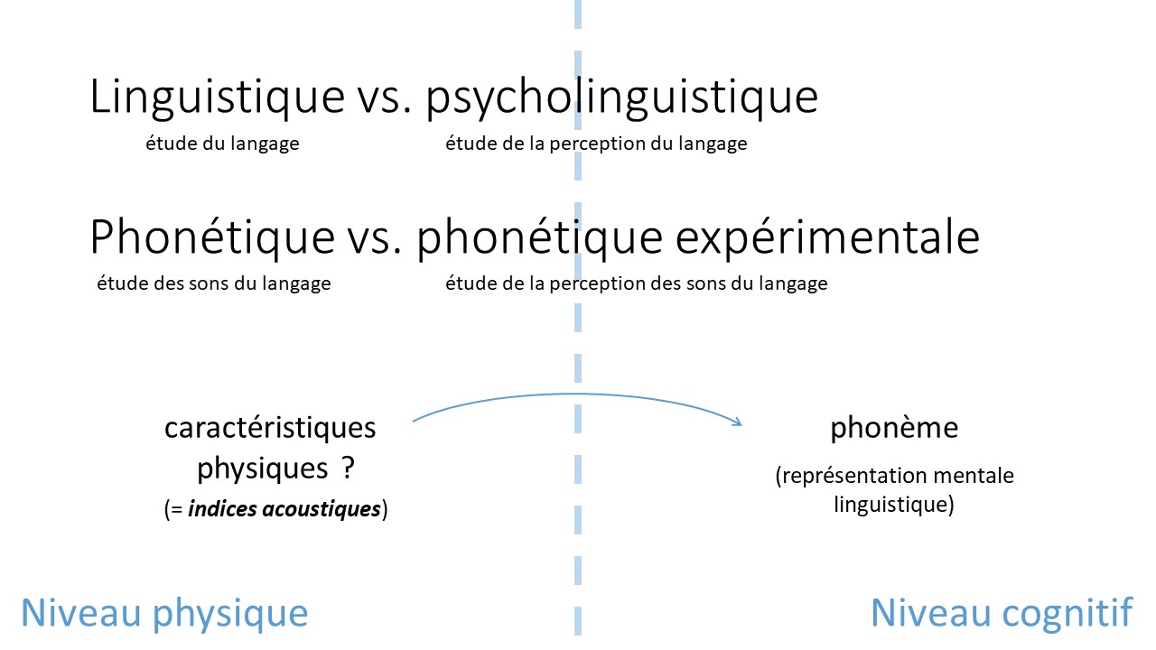 Comme au chapitre précédent, l’objectif est donc de mettre en évidence la relation entre le son (de parole) et les représentations mentales que celui-ci évoque dans notre esprit (ici des représentations linguistiques, les phonèmes). Par exemple, pourquoi tel son est-il perçu comme un “b” et tel autre comme un “d” ? Soulignons que le phonème est bien un objet cognitif, et non physique. Il n’est pas contenu dans le son même mais seulement dans l’esprit des locuteurs et locutrices de la langue.