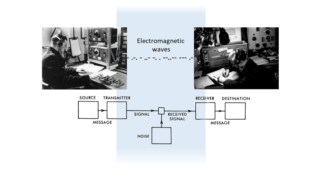Quelque soit le système de télécommunication considéré, la situation peut être schématisée de la façon suivante (voir figure xxx) : un émetteur ou une émettrice souhaite transmettre un message à un·e destinataire. Pour couvrir la distance qui les sépare il est nécessaire de prendre appui sur un certain medium, c’est à dire un substrat physique qui porte le message, comme les ondes électromagnétiques dans le cas du code morse. Le message ne pouvant être converti directement en ondes électromagnétiques, il faut au préalable le coder dans un format plus adéquat et plus robuste, ici une série de traits et de points. Ce code est ensuite envoyé par l’émetteur·ice, puis réceptionné par le ou la destinataire qui devra le décoder pour revenir au message original. Cette formalisation est au centre de la théorie de l’information, cadre mathématique qui permet d’évaluer l’efficacité d’un code particulier et de déterminer le code le mieux adapté, en particulier dans le cas où la transmission est dégradée par des interférences.