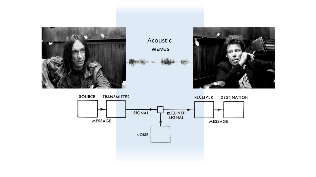 Cette conceptualisation de la télécommunication comme une opération de codage / transmission bruitée / décodage est également tout à fait valide dans le cas de la communication parlée. Les deux interlocuteur·ices qui se font face doivent ici, pour transmettre le message formé dans leur esprit, le convertir sous une forme pouvant être véhiculée dans l’air. Cette forme est le son de parole, une organisation particulière des vibrations de l’air qui forme un code permettant de transporter une infinité de messages différents. Comme nous le verrons plus loin, ce code est particulièrement robuste aux interférences, comme la présence d’un bruit de fond si la conversation n’a pas lieu dans un environnement parfaitement silencieux.
