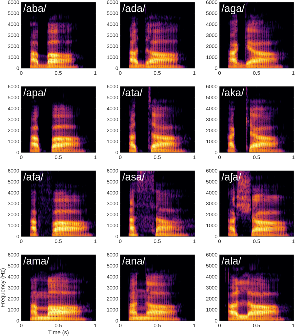 Fig. 93 Spectrogrammes de 12 consonnes du français, précédées et suivies d’un “a” : “aba”, “ada”, “aga”, “apa”, “ata”, “aka”, “afa”, “asa”, “aʃa”, “ama”, “ana” et “ala”.#