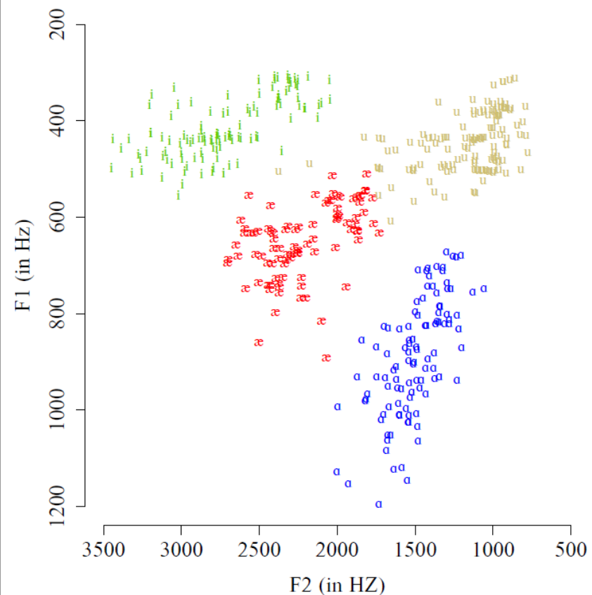 Des experiences en synthèse vocale suggèrent que les deux premiers formants sont suffisants pour identifier les voyelles, même lorsque les formants 3 et 4 sont fixés à des valeurs intermédiaires. Ceci a conduit les scientifiques à représenter les voyelles dans un espace à deux dimensions, appelé triangle vocalique ou espace vocalique (vowel space), correspondants aux fréquences du premier et du deuxième formant. Ainsi, Hillenbrand et collègues (1995) Xxxxx ont enregistré un grand nombre de productions de la voyelle /a/ par différents locuteurs et locutrices anglophones Xxxx, puis, pour chaque enregistrement, ont mesuré les valeurs de F1 et de F2 et les ont reportées sur un graphe. La figure Xxxx présente le résultat : chaque point (indiqué par le symbole Xxxxx) représente un enregistrement particulier de la voyelle, avec les valeurs de F1 et de F2 en x et en y, respectivement Xxxxx.