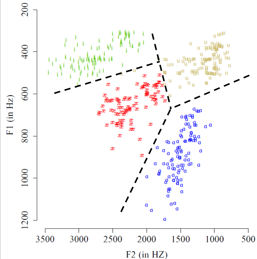 Schématiquement, on peut dire qu’il est nécessaire de placer des frontières phonémiques dans l’espace acoustique pour délimiter quel ensemble de sons correspond à un “i”, un “ou”, un “a” ou un “ae”, comme illustré sur la figure suivante. Il suffirait alors à notre cerveau, lorsqu’il perçoit un son, de mesurer les valeurs de F1 et F2 et de vérifier comment celles-ci se situent par rapport aux diverses frontières phonémiques pour identifier la voyelle prononcée [Notez cependant que d’autres mécanismes de catégorisation sont envisageables, par exemple en calculant la distance du son perçu au centre de chaque catégorie].