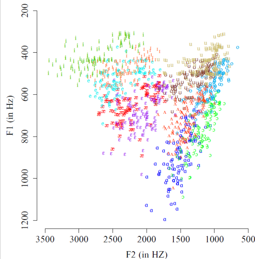 Malheureusement, la situation n’est pas aussi simple. En continuant à remplir l’espace vocalique avec l’ensemble des voyelles de l’anglais, nous constatons rapidement que celles-ci se recouvrent dans une large mesure. Ainsi, par exemple, la région de l’espace F1-F2 correspondant à la voyelle Xxxx est partagée avec les voyelles xxx et xxx. Autrement dit, pour un grand nombre de sons (c’est-à-dire de points sur la figure), je ne peux pas déterminer avec certitude s’il s’agit d’une voyelle ou d’une autre : F1 et F2 ne permettent pas d’identifier les voyelles de façon univoque.