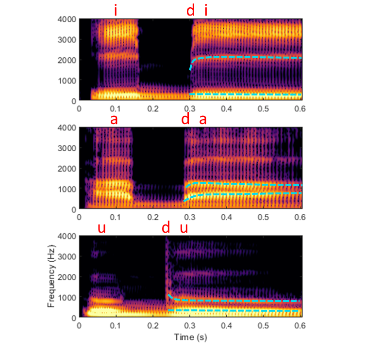 Ainsi, de subtiles variations dans la position des articulateurs se traduisent par des différences perceptibles dans les sons de parole. On peut se rendre compte facilement du fait que les résonances de la cavité orale sont déterminantes pour l’identité de la voyelle : dans la vidéo ci-dessous, différents tubes ont été conçus pour imiter la forme de la cavité buccale pour différentes voyelles (comme illustré dans la seconde ligne de la figure Xxxx). Un buzzer est placé à l’entrée de chacun de ces tubes, de façon à ce que le son résonne dans cette structure. À l’autre extrémité du tube, on entend clairement la voyelle correspondant à la forme de la cavité, ce qui indique que les résonances sont essentielles pour la compréhension.