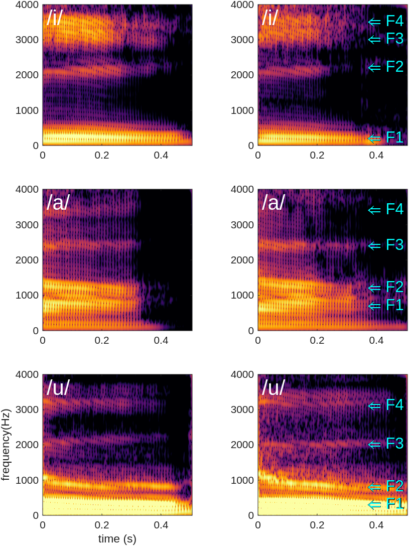 La figure suivante présente les spectrogrammes de 3 voyelles du français : “i”, “a” et “ou”. Deux enregistrements de chaque voyelle sont présentés, ce qui permet de remarquer une caractéristique frappante : la présences de bandes d’énergies relativement stables dans le temps, et dont les fréquences semblent dépendre de la voyelle prononcée. Ces maxima spectraux sont appelés formants et numérotés des basses fréquences vers les hautes : le premier formant (F1) est le plus grave, puis vient le deuxième formant (F2), etc. Notez que les spectrogrammes présentent également des raies verticales régulièrement espacées. Celles-ci correspondent à la périodicité du son et donc à la hauteur de la voix (appelée fréquence fondamentale), et elles sont globalement indépendantes des formants.